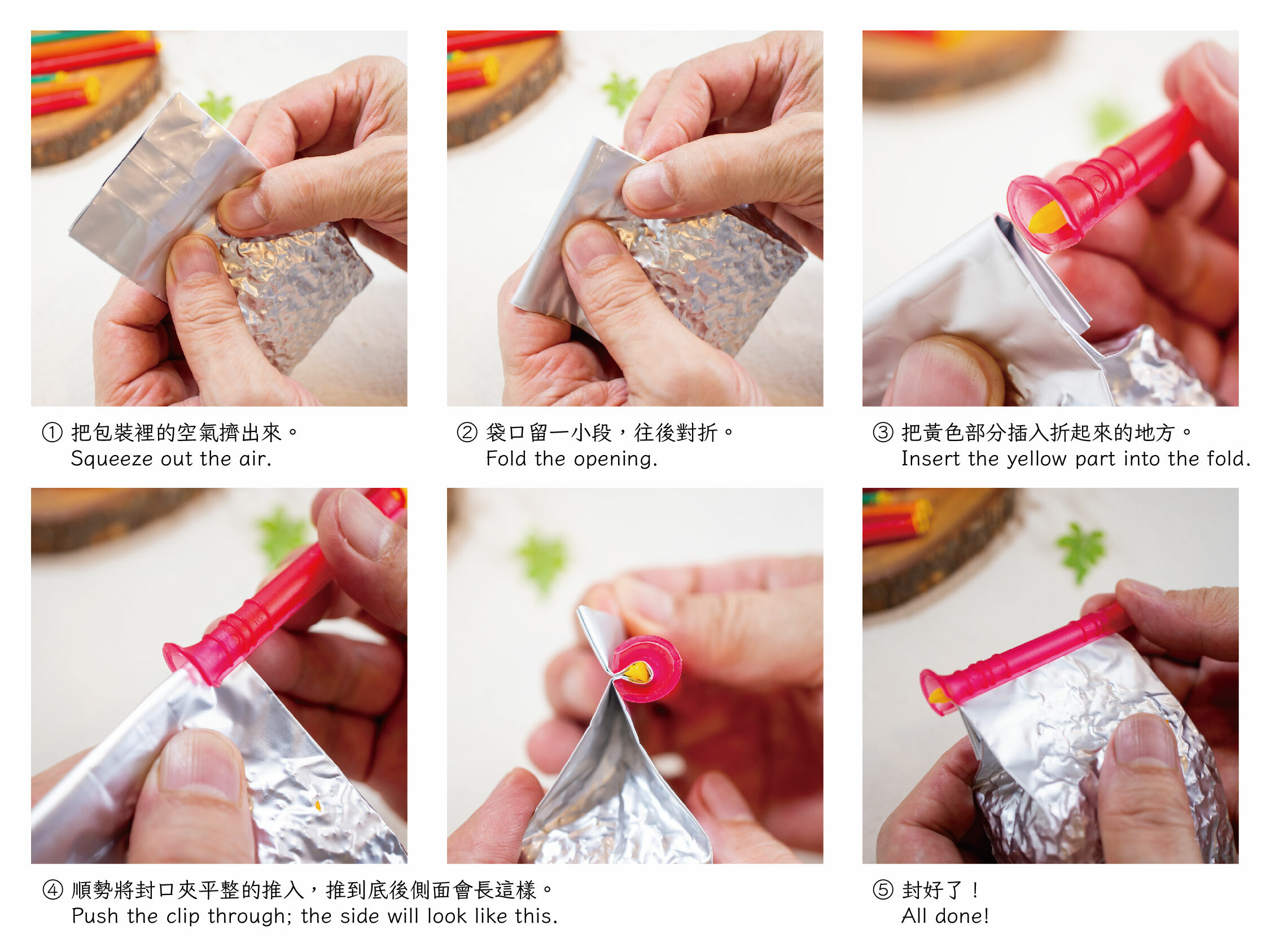 Package sealer made to help keep you opened packet of tea away from humidity and oder. The hoop on the end allows you to tag your teas.